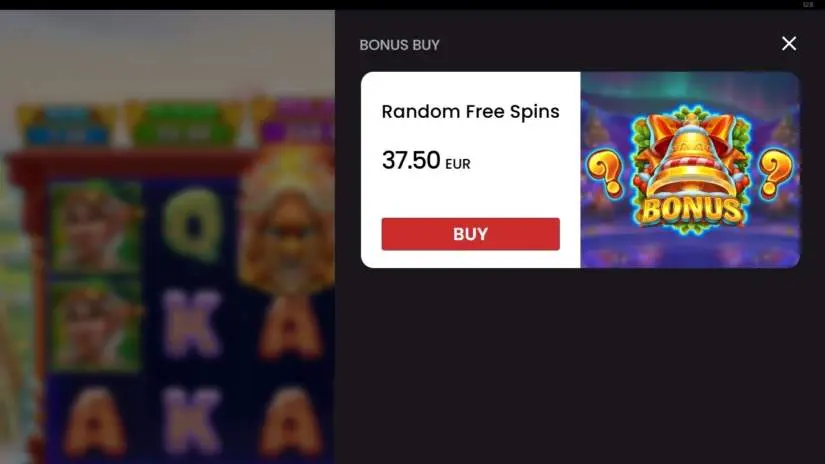 By clicking the button, you’ll have the option to purchase the Free Spins feature. You can decrease or increase your base bet by clicking the “+” or “-” buttons. If you click “Buy,” you’ll be able to confirm your bonus purchase by clicking “OK.” This will trigger the Free Spins feature and deduct the specified bonus amount from your balance. If you click “Cancel,” you’ll be returned to the bonus purchase page. Bonus purchase options:
