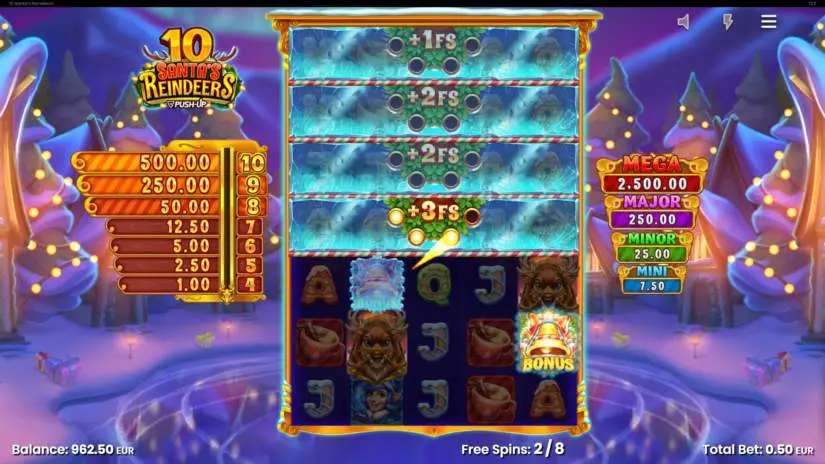 A distinctive feature we especially love is the “Push-Up” mode. For an additional fee, you can expand the reel set in the main game, increasing your chances of landing deer and bell symbols. This also ensures that the bonus game begins with unlocked reels, adding even more excitement!
