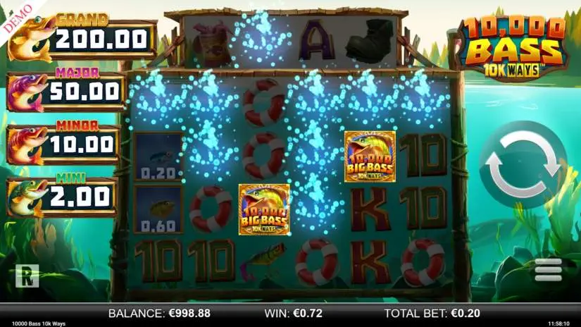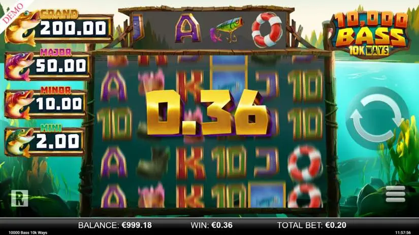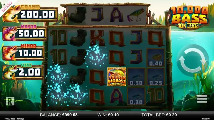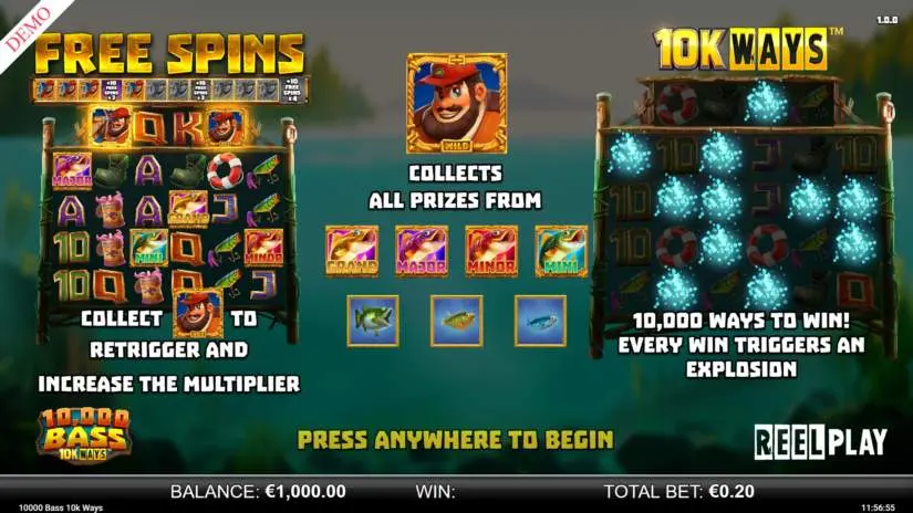 10,000 Big Bass 10K Ways™ by ReelPlay is a 10K WAYS™ slot game with up to 10,000 ways to win. The game has 6 reels: 4 rows on reels 1 and 6, and 5 rows (including the top reel) on reels 2, 3, 4 and 5. The average theoretical return to player (RTP) is 94.36%.