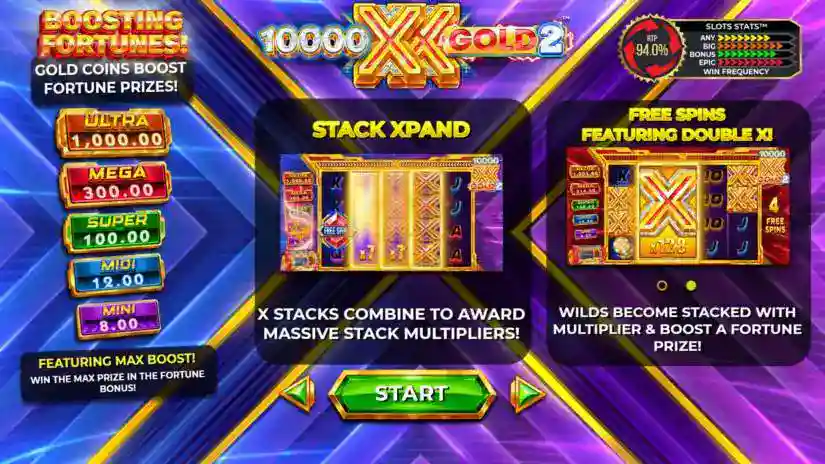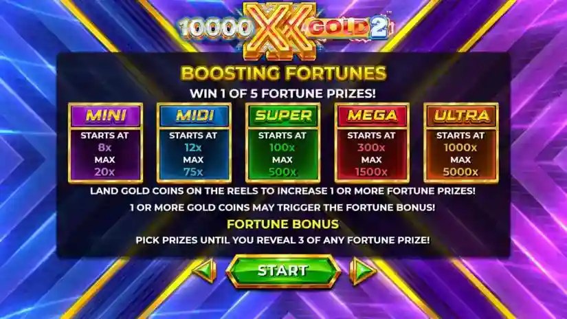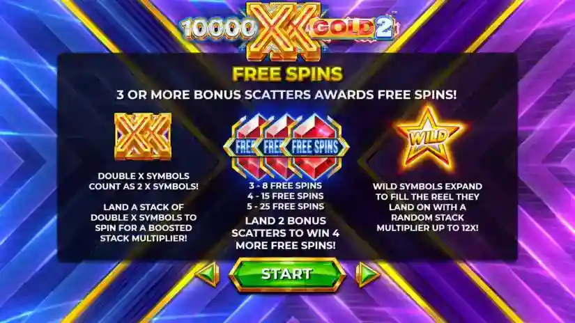 Welcome to 10,000 X Gold 2 from 4ThePlayer! Experience extreme thrills with huge wins and 5 prizes that boost your luck! Free spins with double X symbols await for exciting wins!