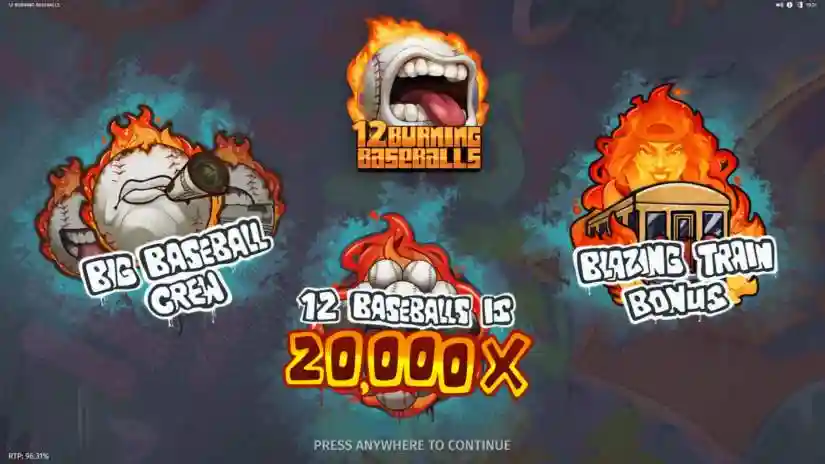 12 Burning Baseballs is a 5-reel, 3-row, 10-payline slot from Print Studios that features the Burning Baseballs, Big Baseball Crew, Home Run Spins, and Blazing Train Bonus features.