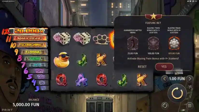 Locating enough flaming baseballs to trigger the top-tier free spins feature, “Burning Train,” immediately activates the feature and replaces the corresponding Scatter prize with a cash prize.