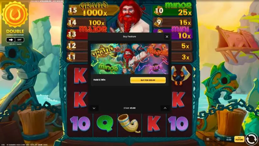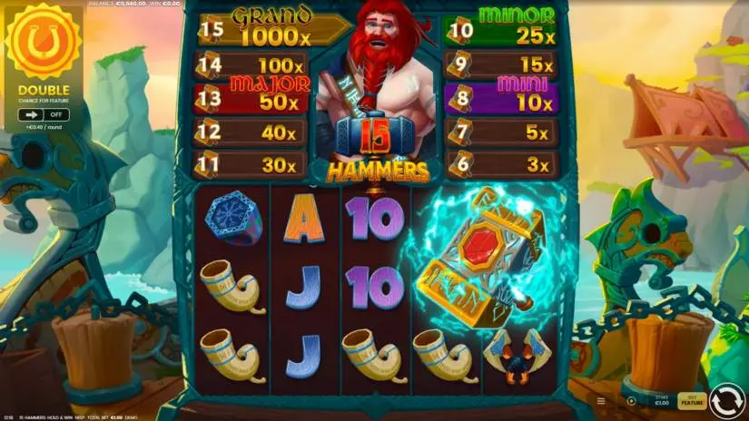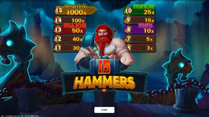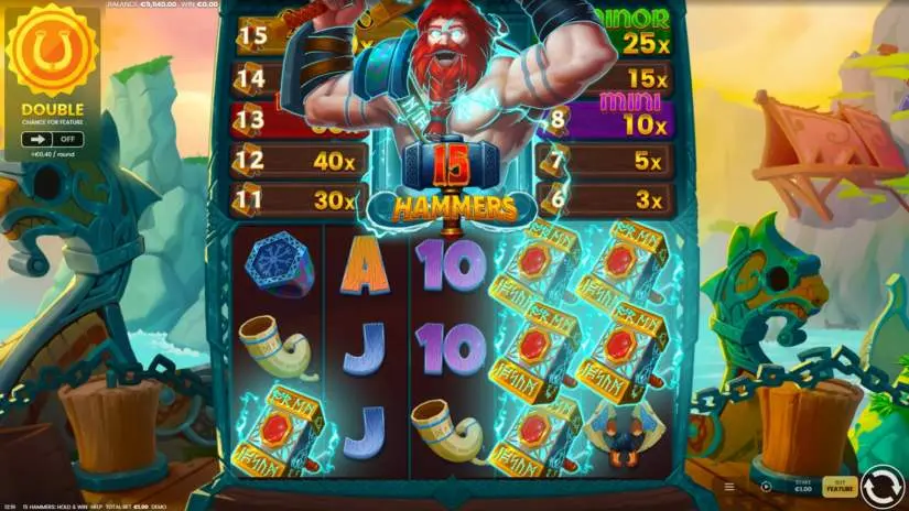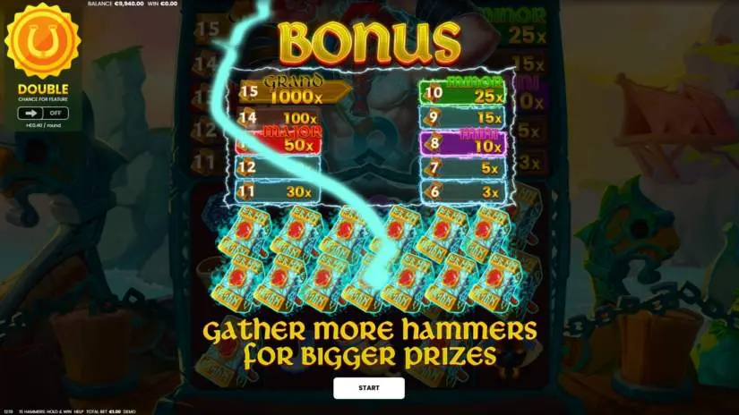 At the end of each Hold & Win feature, cash prizes are paid based on the number of Hammer symbols on the reels. All cash prizes are won, including the prize corresponding to the number of Hammer symbols: