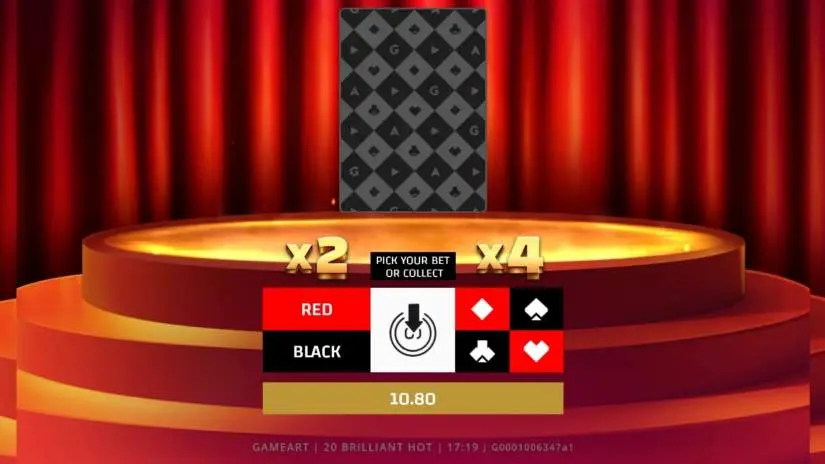 To risk your winnings on 20 Brilliant Hot, click the “Play to Win” button. Choose a red or black card to double your winnings. Choose a suit to quadruple your winnings. Your winnings are multiplied if you choose correctly. You can risk your winnings up to 5 times. The “Play to Win” feature can be enabled/disabled in the “Settings” menu. A loss in the “Play to Win” feature results in the forfeit of all winnings. In some jurisdictions, the “Play to Win” feature may be disabled.