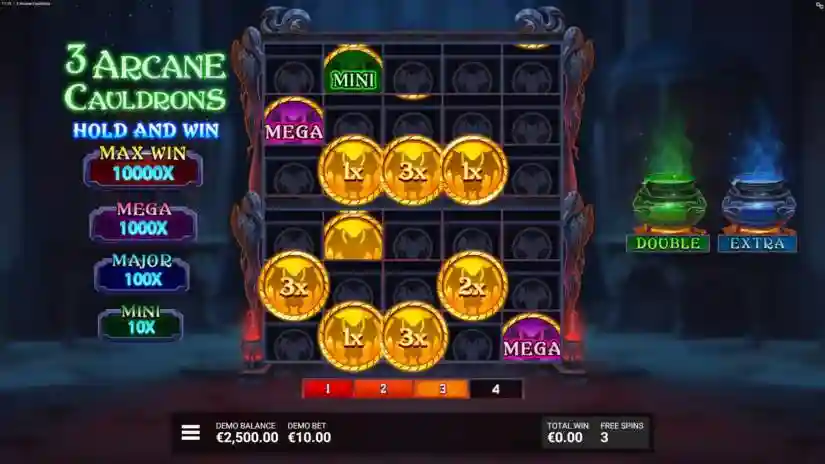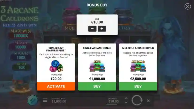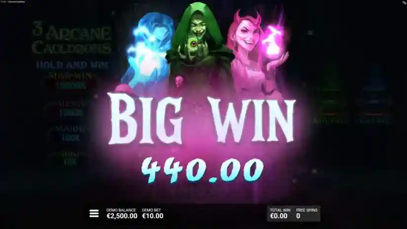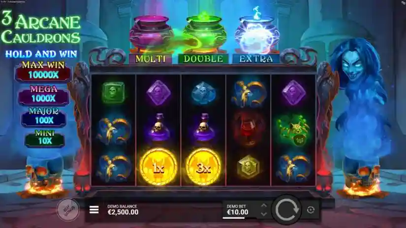 The maximum win in 3 Arcane Cauldrons is 10,000x multiplied by the current bet level. The maximum win can be achieved by activating certain combinations and/or features.