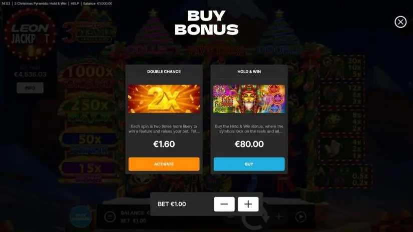 The Hold ‘n’ Win bonus begins with 3 free spins. During the Hold ‘n’ Win bonus, the reels only contain Gold Coin symbols, Special Coin symbols corresponding to the activated Christmas tree, blank symbols, and Christmas Tree Trigger symbols. Each time any symbol other than a blank symbol lands on the reels, the number of free spins is restored to 3.