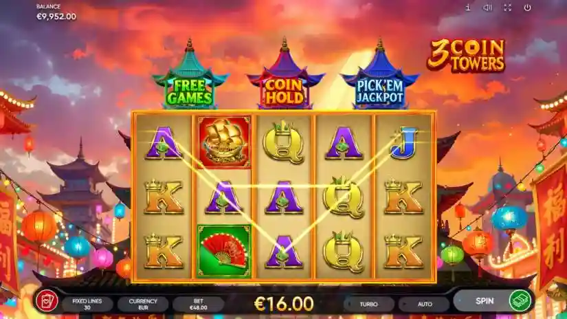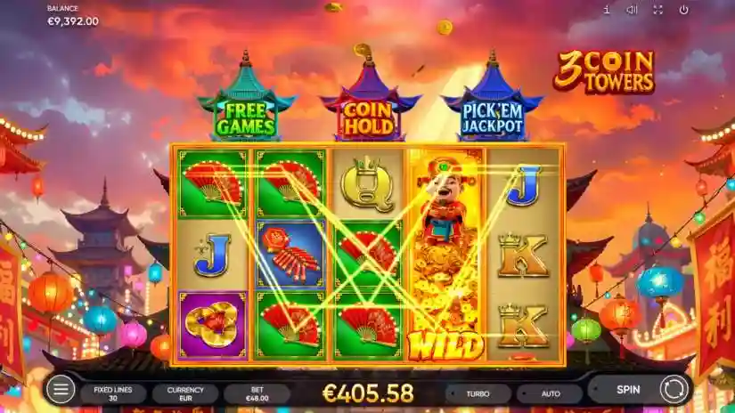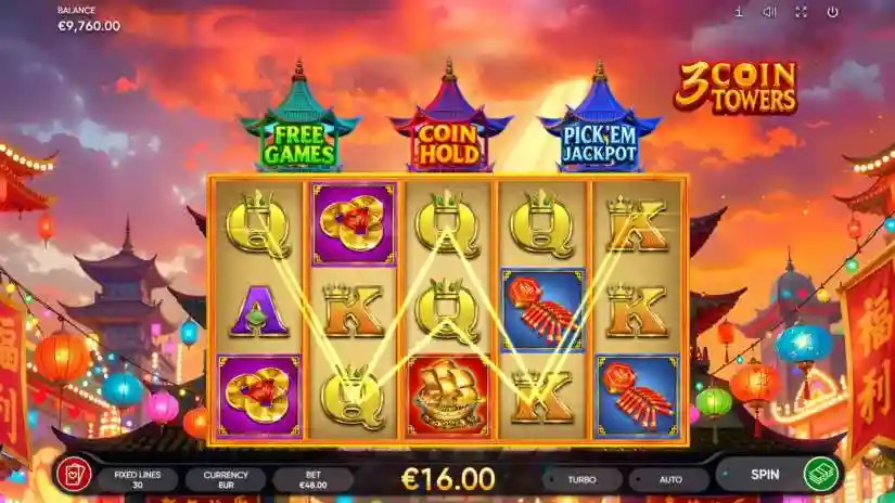 A Fortune Festival awaits you in 3 Coin Towers, where three majestic pagodas hold powerful bonuses. Lift the green pagoda to receive 88 free spins, the red pagoda to unlock the Coin Hold bonus with 4 jackpots, or the blue pagoda to receive the Moonlight Pick’em bonus, filled with golden rewards.