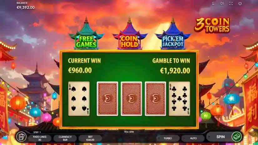 Don’t miss your chance to increase your winnings in the 3 Coin Towers game! Choose one of four face-down cards. If you beat the dealer’s card, your winnings are doubled, and you can place another bet (maximum 10 attempts). If the dealer wins, you lose all your winnings, and the risk game ends.