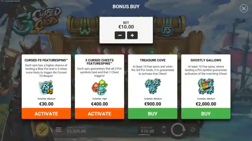 The RTP for purchasing 3 CURSED CHESTS FEATURESPINS™ is 96.32%. For full details on this feature, please see the section above. Each spin guarantees landing all 3 Pot symbols and activating 1 Chest! Volatility: High.