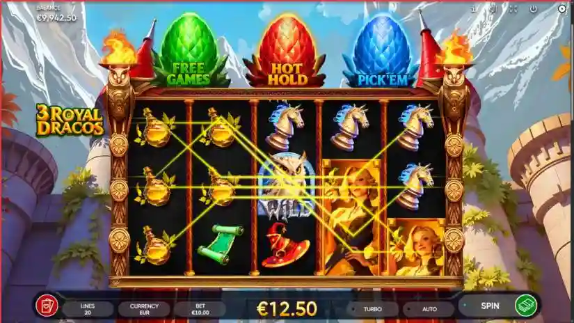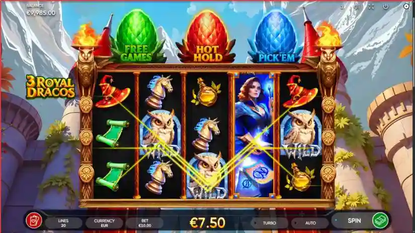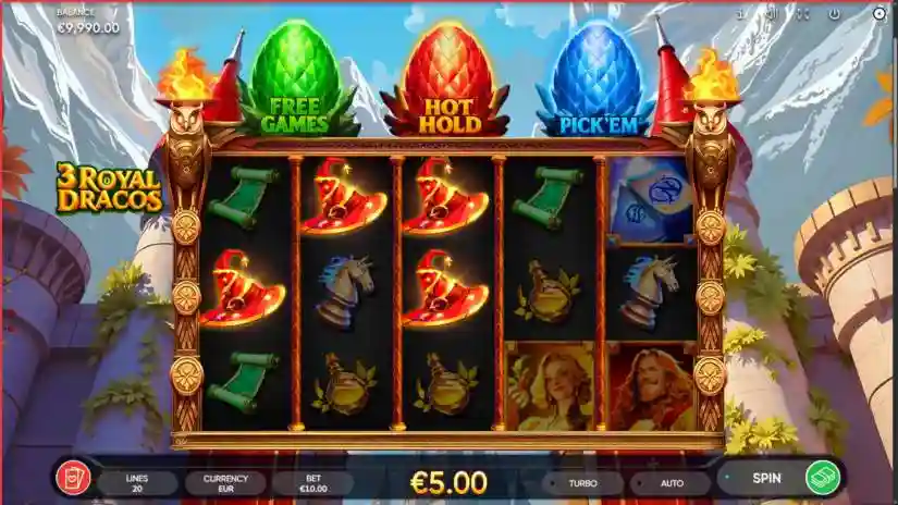 Ancient magic awakens in 3 Royal Dracos, a fantasy slot set in a castle ruled by four legendary wizard families and three powerful dragons. Crack dragon eggs to unlock 24 free spins, a Hold ‘n’ Win bonus with four jackpots, or a Pick Me bonus full of magical rewards.