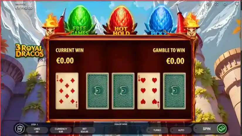 Don’t miss your chance to multiply your winnings in 3 Royal Dracos! Choose one of four face-down cards. If you beat the dealer’s card, your winnings are doubled and you can bet it again (maximum 10 attempts). If the dealer wins, you lose all your winnings and the Risk Game ends.