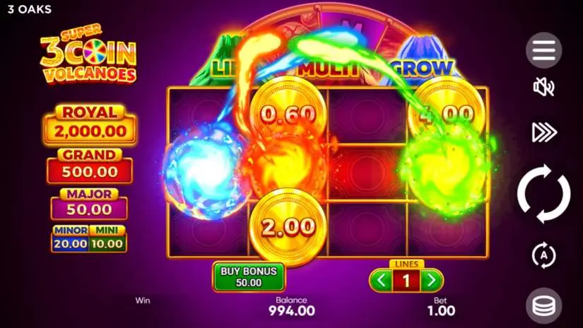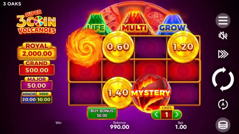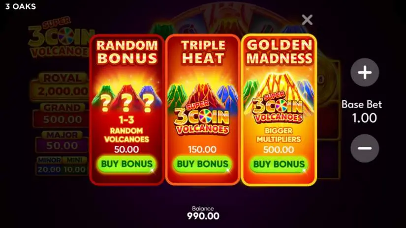 The main game, 3 Super Coin Volcanoes by 3 Oaks Gaming, has no regular symbols. Payouts are only made during the bonus game. The bonus game is triggered by landing a combination of 4 symbols on any active payline.