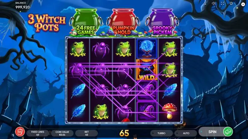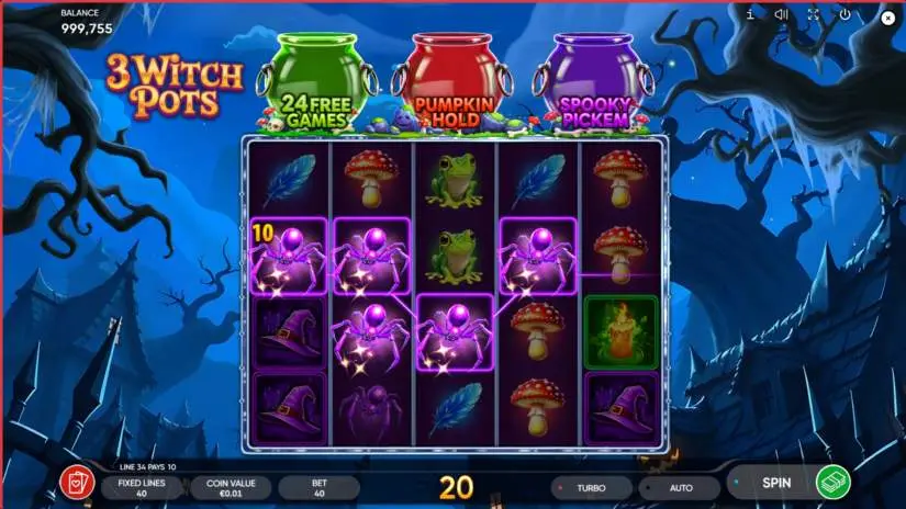3 WITCH POTS is a 5-reel, 4-row, 40-payline slot from Endorphina. All prizes are awarded for matching combinations of symbols. Symbols must be on paylines and adjacent reels, starting with the leftmost one.