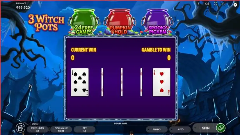 Don’t miss your chance to multiply your winnings in the 3 Witch Pots slot! Choose one of four face-down cards. If you beat the dealer’s card, your winnings are doubled, and you can bet it again (maximum 10 attempts). If the dealer wins, you lose all your winnings, and the Risk Game ends. All face-down cards can be higher than the dealer’s card. All face-down cards can be lower than the dealer’s card. Cards can be repeated from round to round. The probability of receiving cards is unevenly distributed. The Joker beats any card. The Joker never gets the dealer’s card. If your card is equal to the dealer’s card, the game is a draw. Your winnings remain unchanged, and a new round begins. If you don’t want to risk, you can opt out and take your money. To do this, click the CLAIM button. The average return to player (RTP) for a Risk Game round is 84% (if you take risks, ignoring the dealer’s card). In each individual case, the probability of winning is higher or lower depending on the dealer’s card: