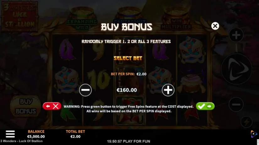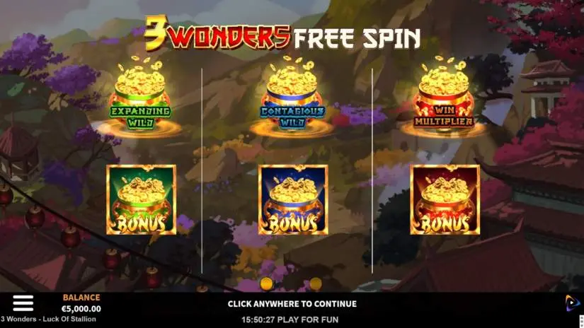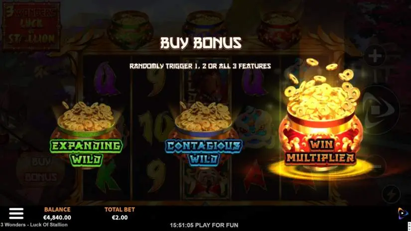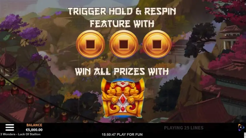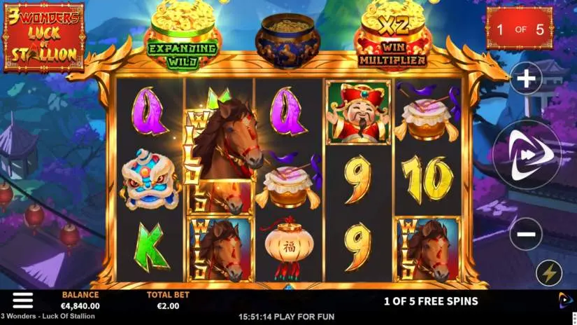 Welcome to the “3 Wonders Luck of Stallion” video slot from Boomerang Studios. It features 5 reels, 3 rows, and the following features: