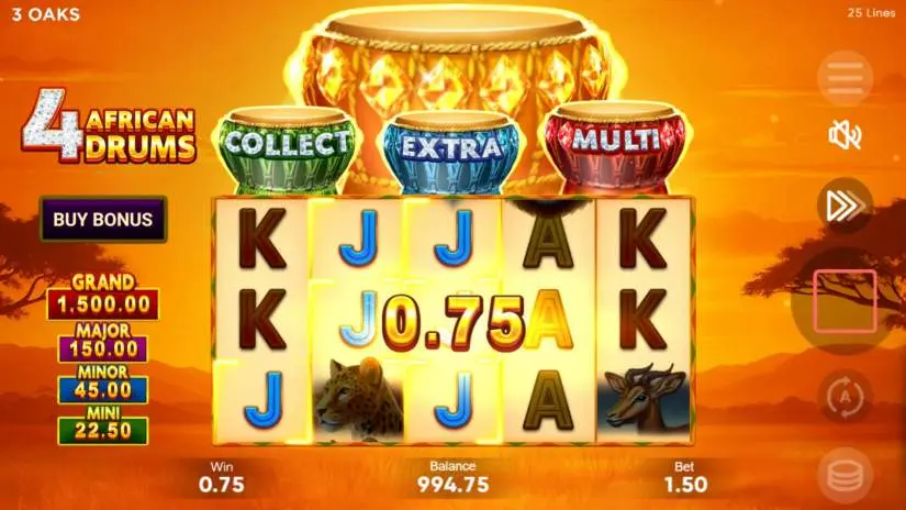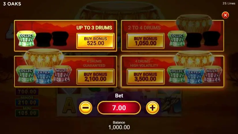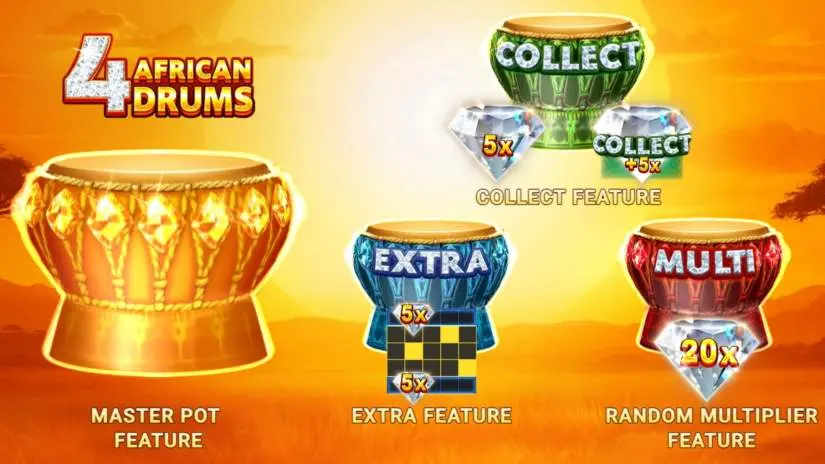 The maximum win in 4 African Drums from 3 Oaks Gaming is 20,000 times the bet. If the total win for a round reaches 20,000 times the bet, the round ends immediately and the maximum win is awarded. Any remaining wins during this round are cancelled.