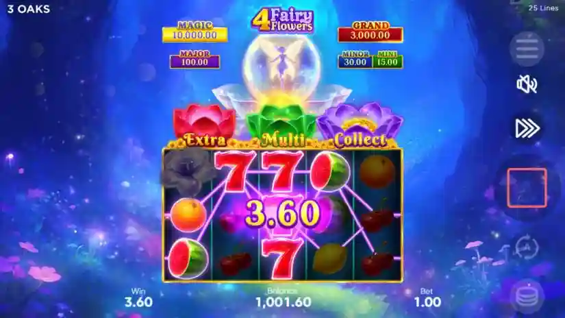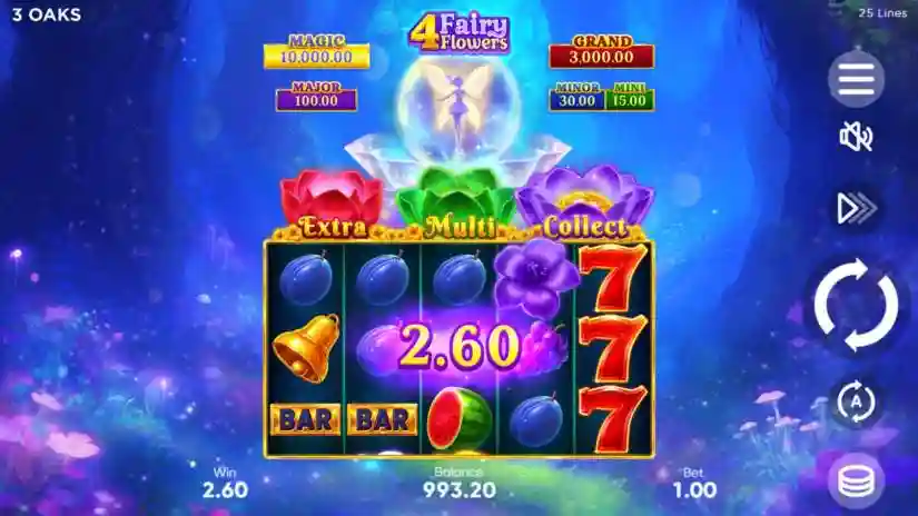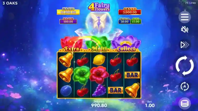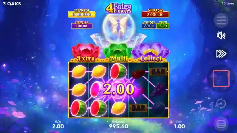 The number of paylines in 4 Fairy Flowers from 3 Oaks Gaming is fixed at 25. The highest-paying combination from left to right is paid out. Simultaneous or matching wins on different lines are added together and paid out.