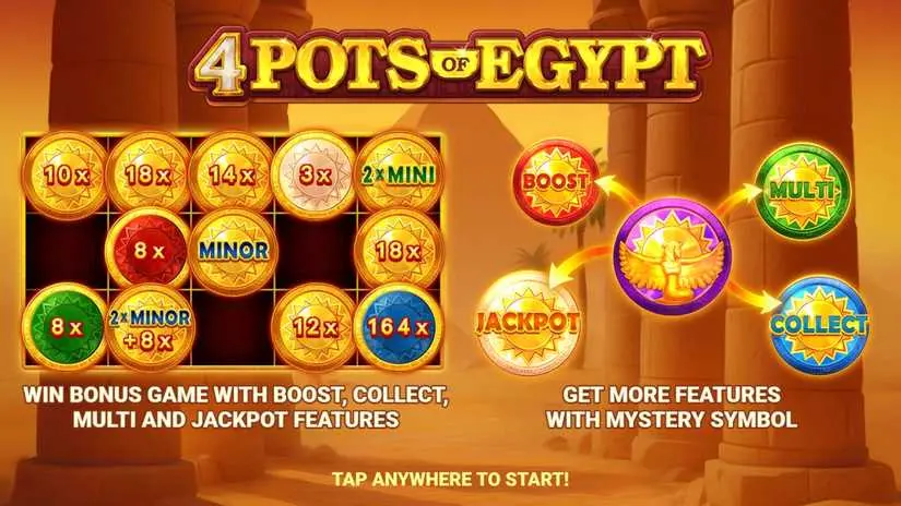 Fill the pots with RED, BLUE, GREEN or WHITE special symbols to trigger the Bonus Game with BOOST, COLLECT, MULTI or ЈАСКРОТ features.