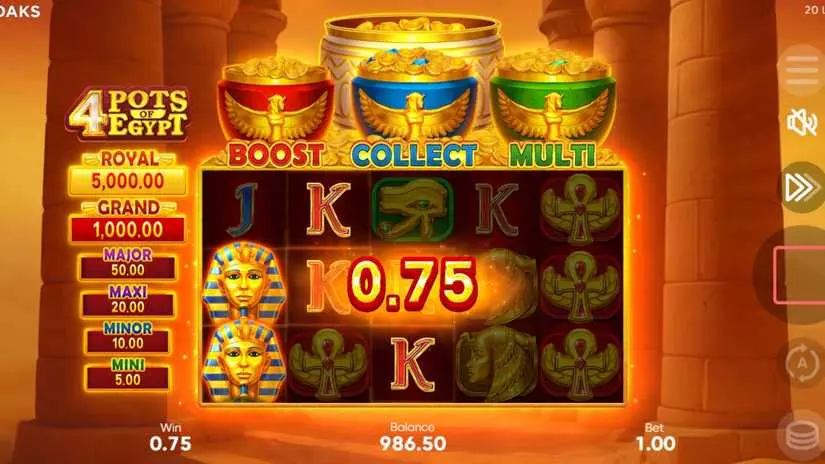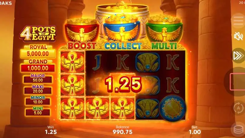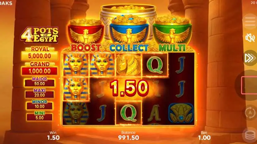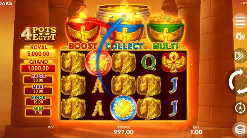 The number of paylines in 4 Pots of Egypt by 3 Oaks Gaming is fixed at 20. The highest-paying combination from left to right is paid. The highest-paying combination on a line is paid.