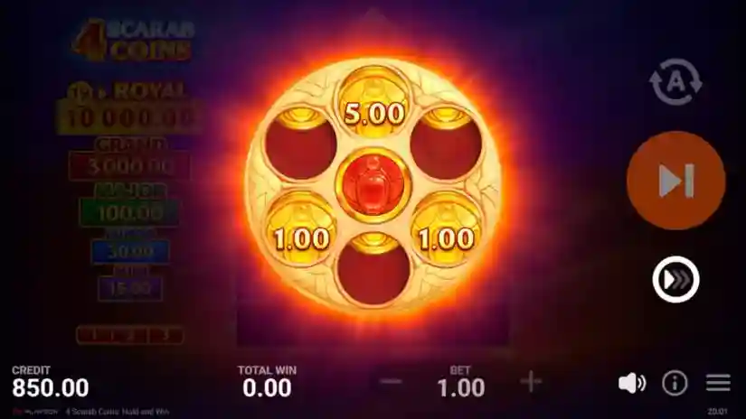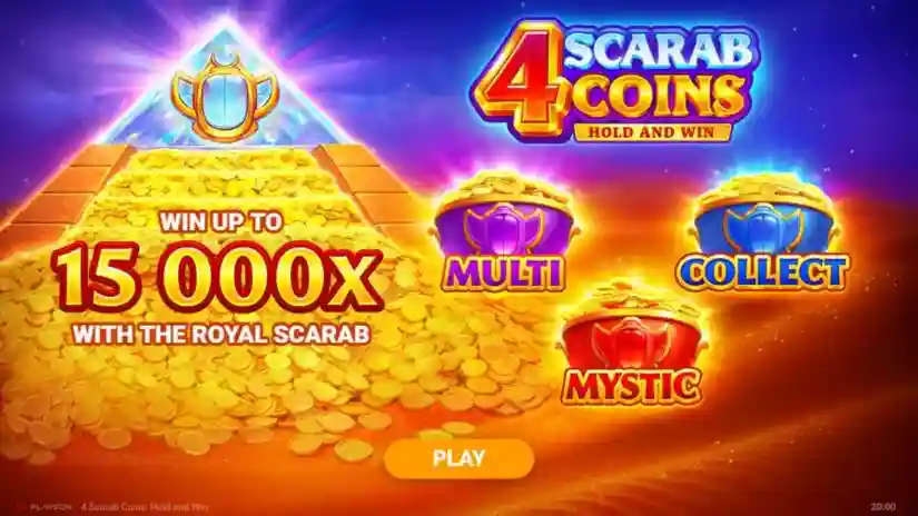 Playson’s maximum reward of 4 Scarab Coins is capped at 15,000x the bet. If the total win for a round reaches the cap, the round ends and the winnings are paid out immediately.