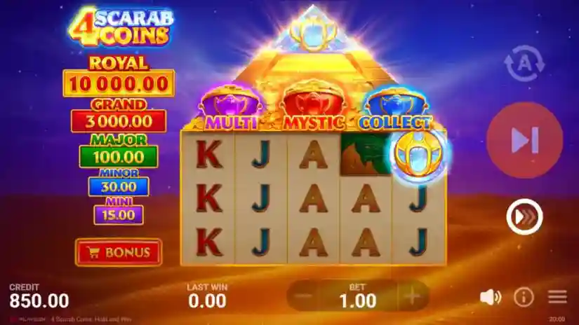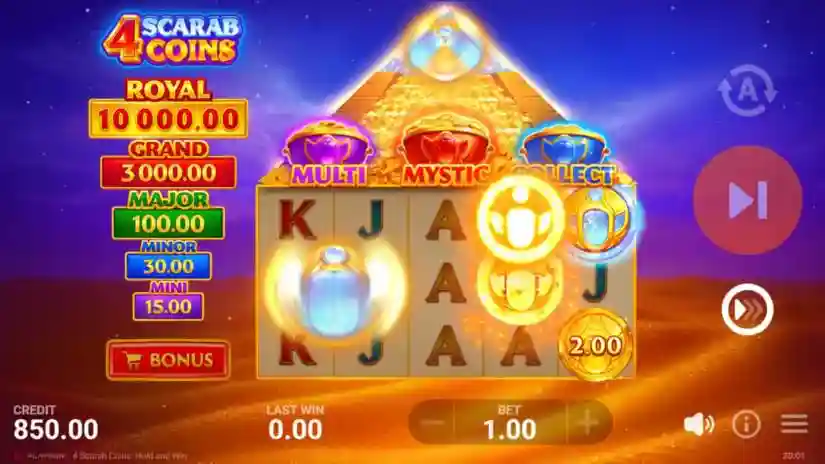 Each Royal Scarab Coin appearing on the reels during the Main Game can trigger the Royal Bonus Game, which features an expanded 5×5 grid and a random Scarab Feature—Multi, Mystic, or Collect—or a random combination of these.