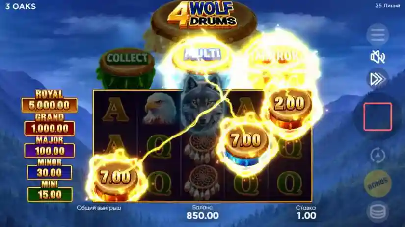 In 4 Wolf Drums from 3 Oaks Gaming, the highest-paying combination from left to right pays out. The number of paylines is fixed at 25. Simultaneous or matching wins on different lines are added together and paid out. The highest-paying combination on a line pays out. Each BONUS symbol can randomly trigger a Bonus Game.