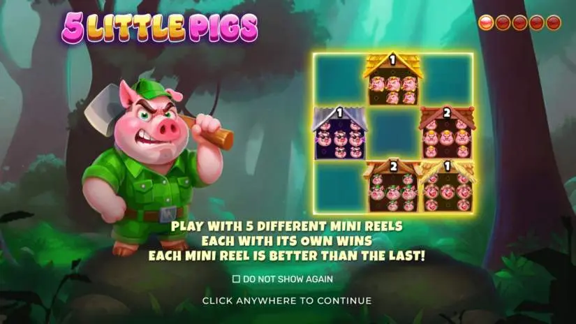 5 Little Pigs by Massive Studios features a 5×4 grid and pays out on 20 paylines. The reels spin, and any win is awarded. Any mini-reel activates the feature. Three or more mini-reels in view activate the full feature.