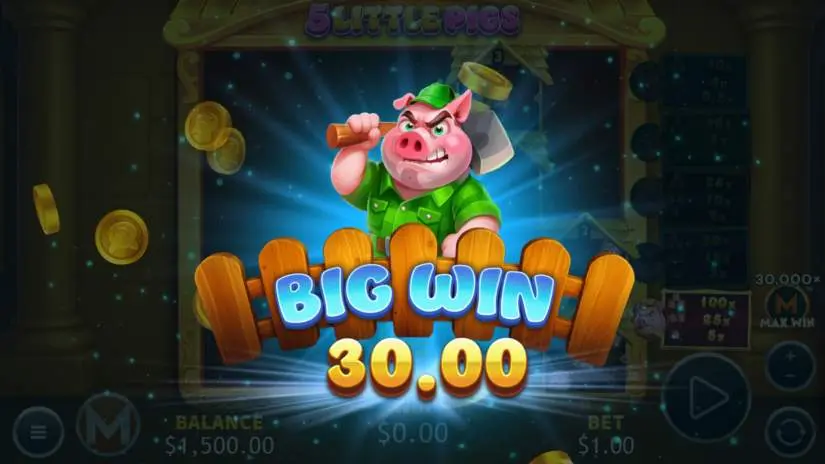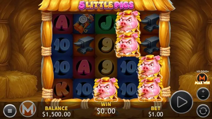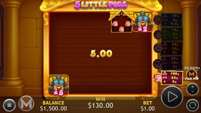 The maximum payout per round of 5 Little Pigs is 15,000 times the current base bet. When playing in advanced modes or with bonus purchases, the maximum payout per round is 30,000 times the current base bet.