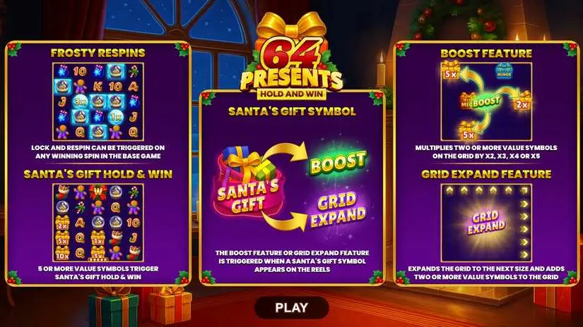 64 Presents Hold And Win is a 5×5, 30-line video slot from Booming Games, featuring Hold & Win – Santa’s Gift and Frozen Respins. This game has only 30 paylines, so you can’t change the number of active paylines. Changing your bet will automatically change the winning amounts shown in the paytable. They will be converted into your chosen currency. When matching symbols line up from left to right on an active payline, you win (see the paytable for details). Only the maximum win amount on an active payline is paid. Only the longest combinations of matching symbols are paid. If you receive more than one win in a single spin, they are added together, then the resulting number is displayed in the “Win” field and added to your balance.