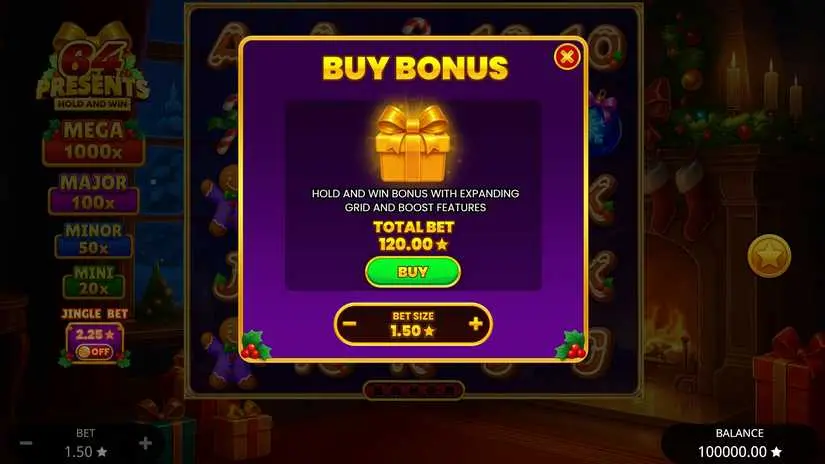 The bonus can be purchased in 64 Presents Hold and Win for 80 times your bet. The bonus feature is activated after purchasing the bonus.