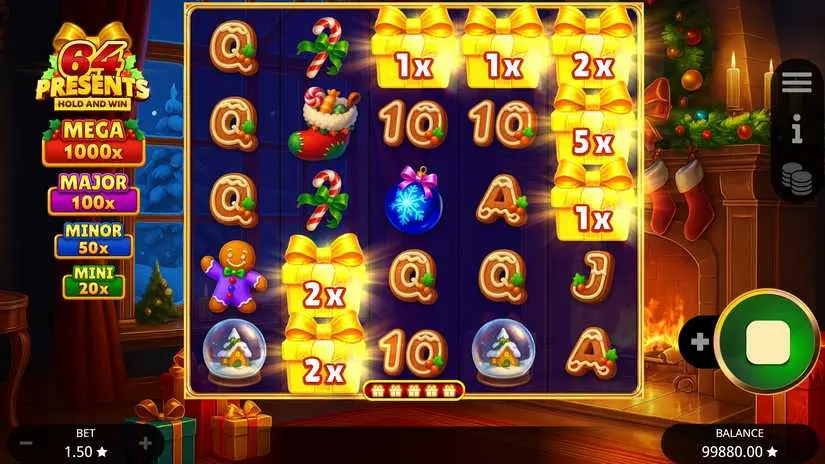 The logo’s appearance is purely aesthetic and does not increase the chances of activating the feature. Five or more symbols with values activate the Hold & Win feature – Santa’s Gift. The feature always activates with three spins, and each time a new value appears, the number of spins resets to three. The feature is activated on a 5×5 grid.