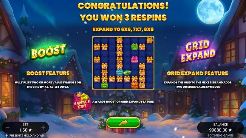 Value symbols can multiply the total bet by 1, 2, 3, 4, 5, 6, 7, 8, 9, 10, 20 (Mini Prize), 50 (Small Prize), 100 (Grand Prize), and 1000 (Mega Prize). Whenever the Hold & Win – Santa’s Gift symbol appears, the player is awarded the BOOST or GRID EXPAND feature. The BOOST feature increases the values of two or more symbols on the grid by 2, 3, 4, or 5 times. The GRID EXPAND feature expands the grid to the next size and adds two or more value symbols to it. The Hold & Win – Santa’s Gift symbol resets the number of spins to 3 and is removed on the next spin. Up to 2 Hold & Win – Santa’s Gift symbols can appear on the playing field. When there are no more spins left or all positions on the reels are filled with symbols with values, the player is awarded a prize equal to the sum of all visible values.