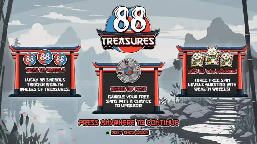 Welcome to 88 Treasures from Degen Studios! Immerse yourself in a serene Asian temple surrounded by cherry blossoms, where a disciplined warrior monk guards ancient treasures with honor. 88 Treasures is a 5-reel, 4-row video slot that pays out wins on 14 fixed paylines for 3 or more matching symbols, starting from the left-most reel and moving left to right. The slot features 1 high-paying symbol, 4 mid-paying symbols, 5 low-paying symbols, and a special “88” symbol. WIN UP TO 20,000X YOUR BET!