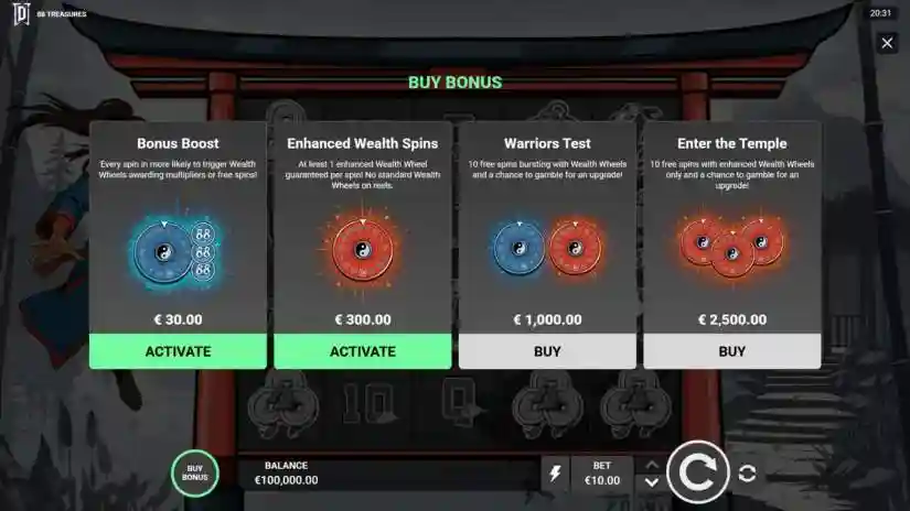 Trigger 10 Free Spins by landing two “88” symbols on the standard Wealth Wheels in the main game or upgrading them using the Gamble feature. During the Temple Entrance Free Spins:
