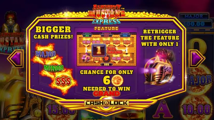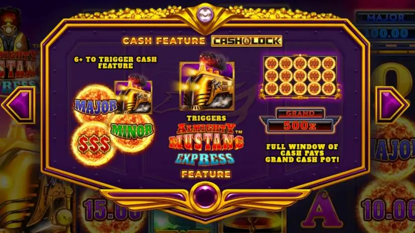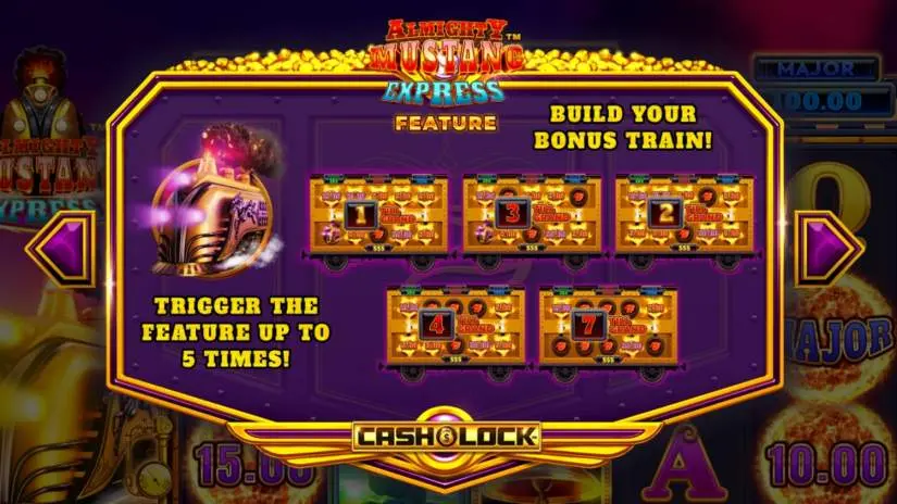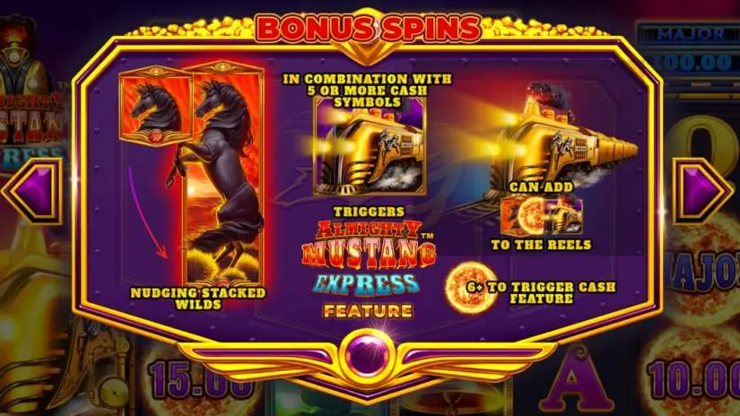 The Bonus Spins feature a different set of reels with stacked Wilds. If the Cash Feature is triggered from the Cash Feature, it will be played immediately after the first spin win is assessed. After the Cash Feature and all subsequent Almighty Mustang Express features are completed, the game returns to the Cash Feature to play the remaining Cash Features.
