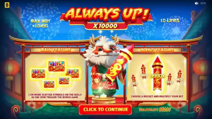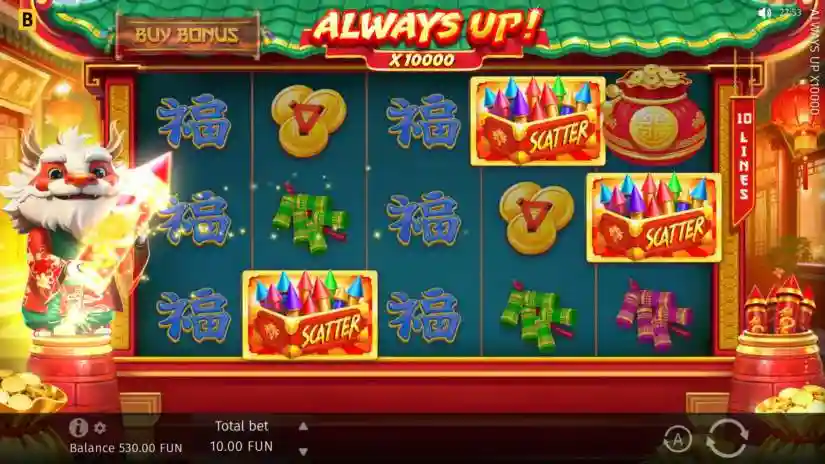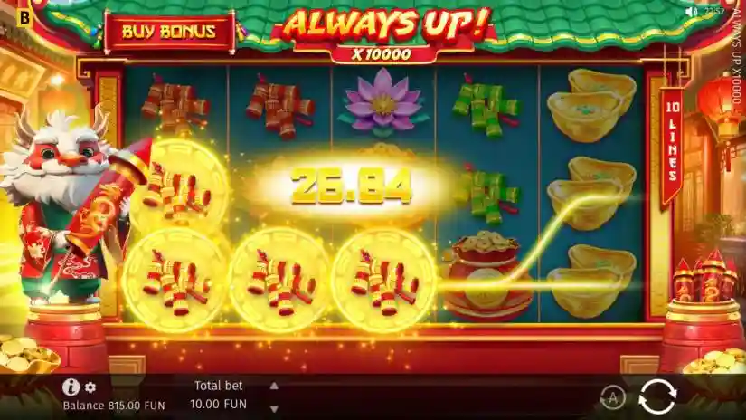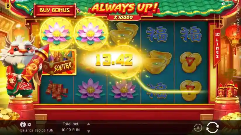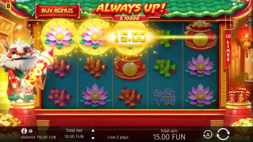 An ancient—and most charming—dragon invites you to admire its many treasures in the Always Up! x10000 slot from BGaming: pots of gold, enchanted lotuses, golden tea bowls, and much more. But the most valuable of all are the fireworks, which paint even the darkest sky with vibrant colors.