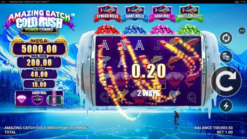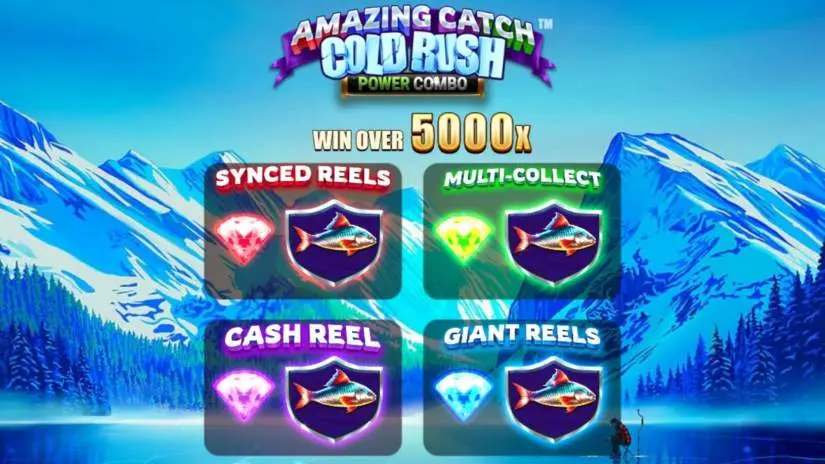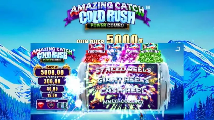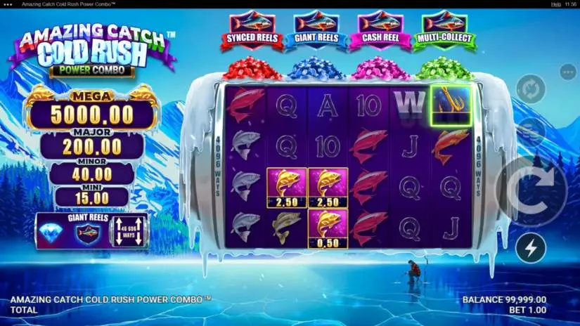 This is the Amazing Catch Cold Rush Power Combo slot machine from Just For The Win, featuring 6 reels and 4 rows. The game features 4096 ways to win. The game features money symbols, collection symbols, token symbols, and a bonus feature with four different features: Giant Reels, Multi-Collect, Cash Reel, and Synced Reels.