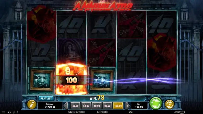 Annihilator by Play’n GO is a 5-reel, 10-fixed-payline slot machine. The PLAYLIST includes a number of hits by the group Annihilator.