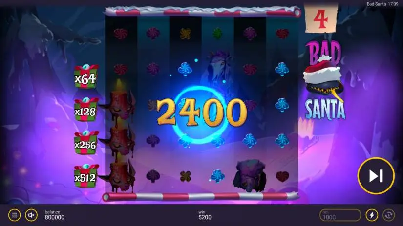 A win is formed in Bad Santa when 8 or more symbols of the same type appear on the reels. The payout for each symbol is displayed in the dynamic paytable. Only the highest win per symbol is paid. Simultaneous or matching wins are added together and paid. The current multiplier is applied to the symbol win. The total win is awarded to the player. This game has a win limit of 20,000x the bet. Further spins are void.