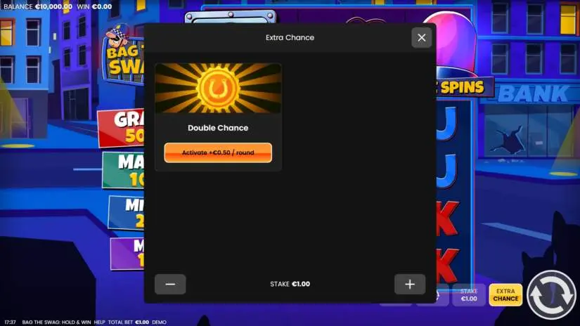 Enabling Double Chance doubles your chances of winning in the game, increasing your total bet on each spin. The amount of the total bet increase is always displayed in the Double Chance window.
