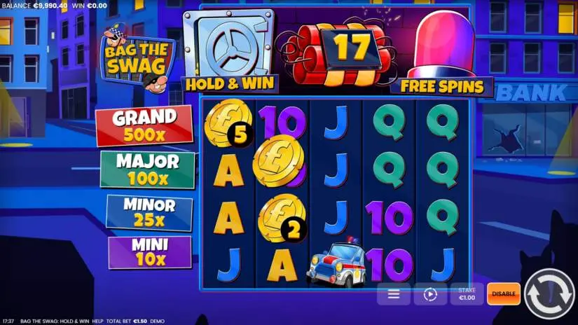 The Hold & Win game begins with 3 free spins. During Hold & Win, only the Golden Coin, Jackpot Coin, Bandit Collect symbols (if unlocked), and blank symbols appear on the reels. Each time a symbol other than a blank symbol appears on the reels, the number of free spins is reset to 3. During Hold & Win, all symbols that land on the reels are locked and remain on the reels until the end of the bonus game, when all prizes are collected. When the slot is full of symbols and no new symbols appear, the feature ends.