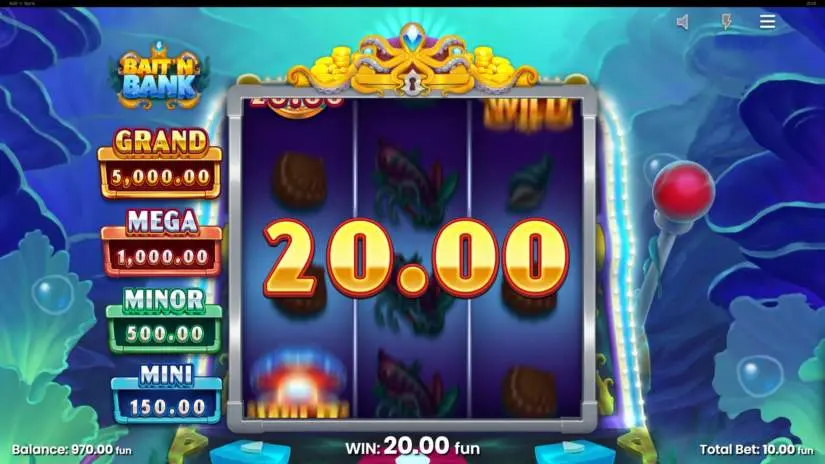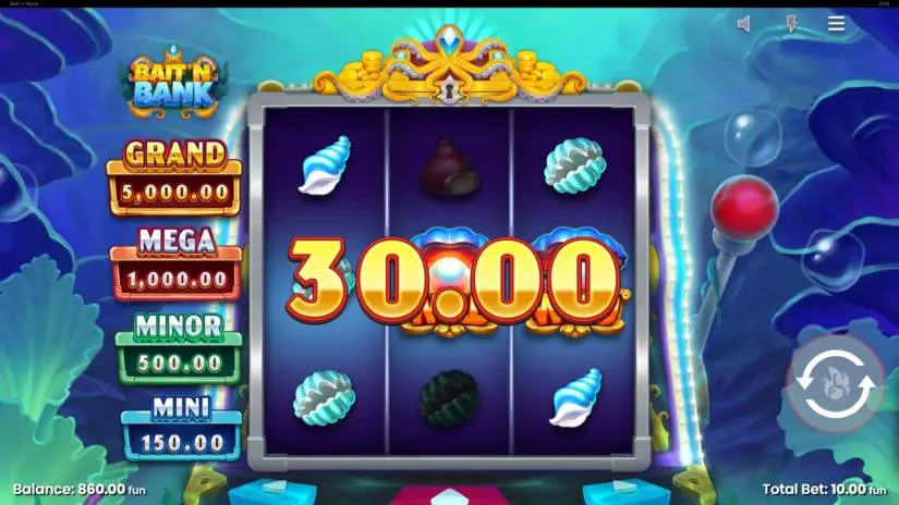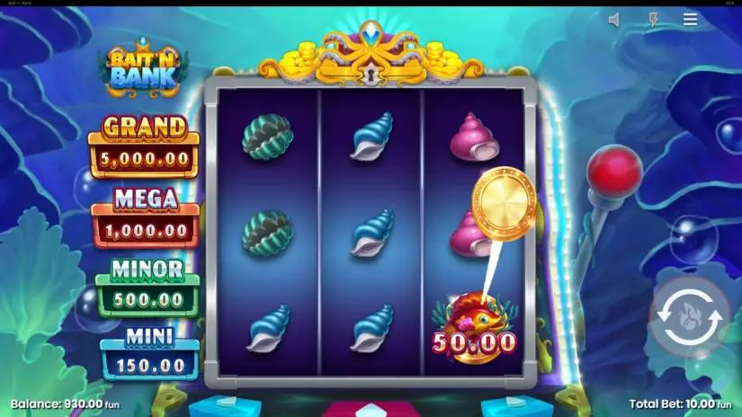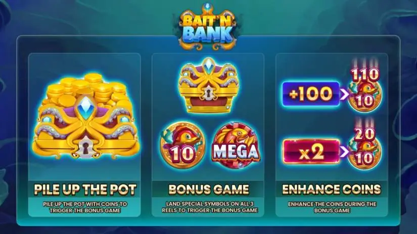 Cast your line and reel in a prize-filled haul in Bait ‘n’ Bank from Push Gaming! Dive into this classic 3×3 slot, where every spin brings instant rewards. Coins and jackpots fall onto the reels, ready to be collected by the Collector mechanic and stored in the vault above, ensuring continuous play! Low volatility, instant prizes, and the refreshing look of a land-based slot make this a simple yet rewarding way to strike it lucky.