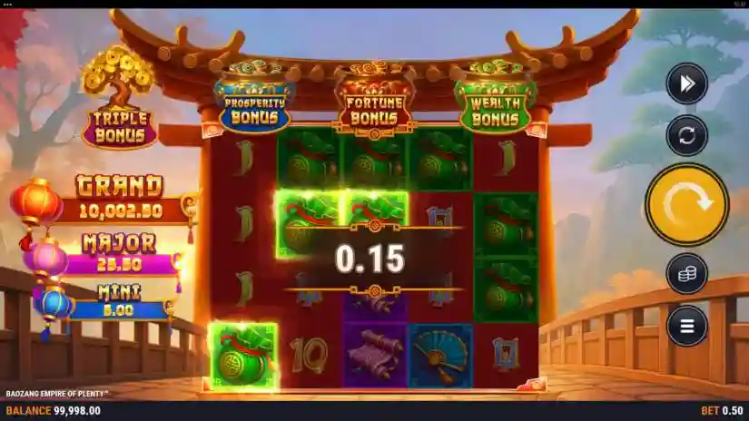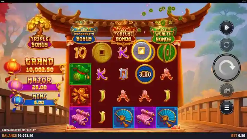 Baozang Empire of Plenty is a 5-reel, 4-row slot machine from Foxium. The goal is to spin the reels until a winning combination appears. Winning combinations are highlighted on the reels and pay out.