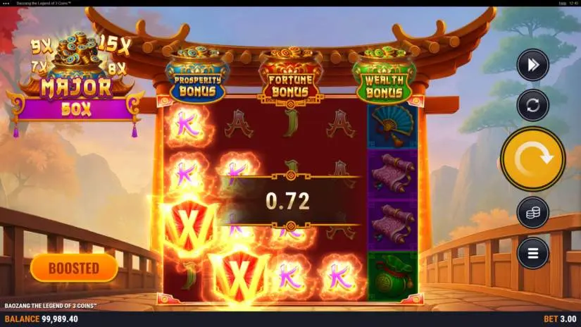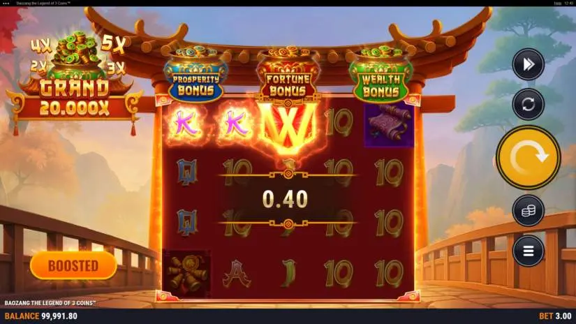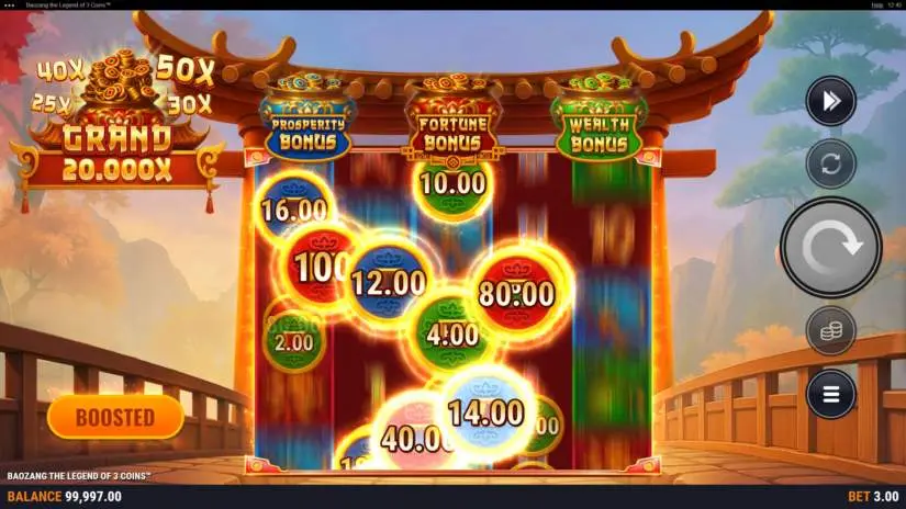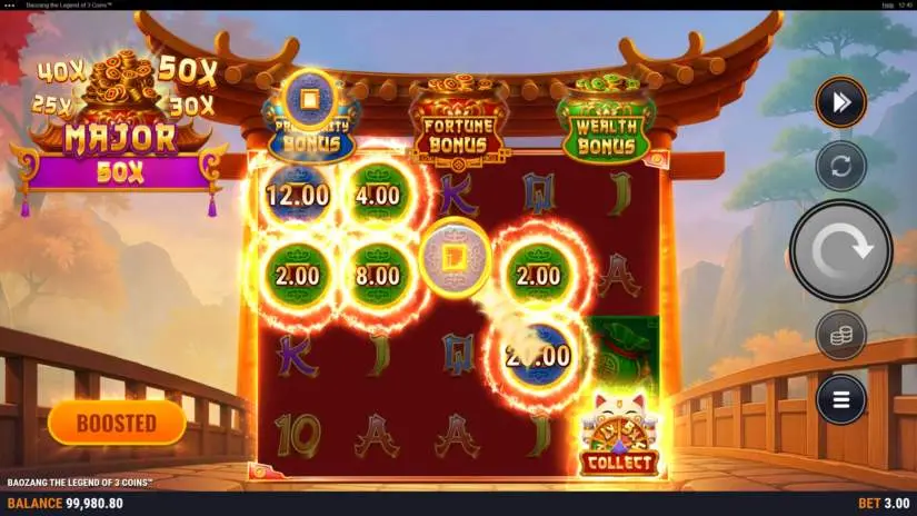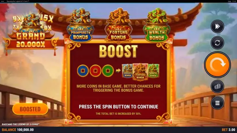 Activating the Boost feature increases your winning potential. More coins are dropped in the main game, with blue and red coins appearing more frequently. The chance of triggering the Fortune, Prosperity, or Wealth bonus game is increased. The final bet is increased by 50%. This feature does not affect payouts. This feature can be activated in the main game.