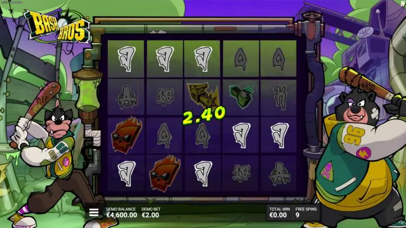 You win in Bash Bros when identical symbols appear on adjacent reels from left to right, starting with the leftmost reel. Each winning combination of identical symbols creates a way to win. The number of possible ways to win in this game is 1024. The number of each symbol needed to win is shown in the paytable.