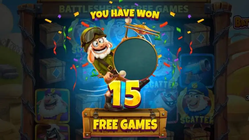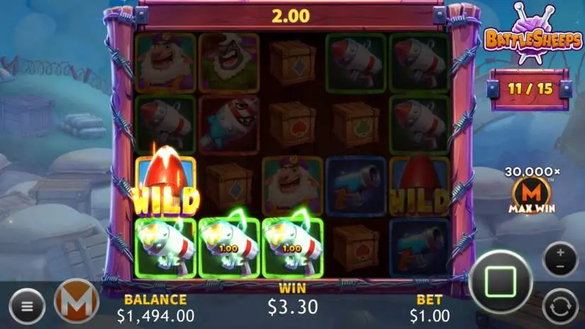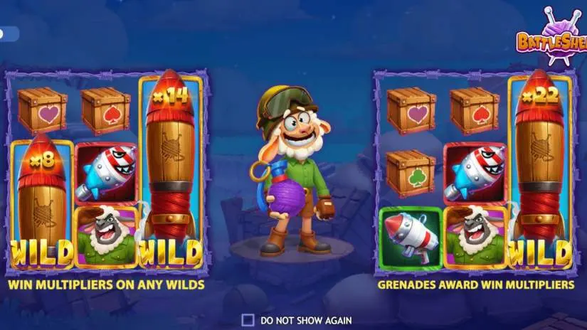 Wild symbols can spin from 1 to 4 symbols high. BattleSheep can throw grenades at these Wild symbols at any time.