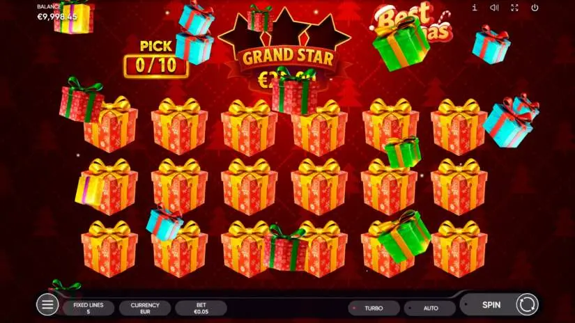 You initially have 10 attempts, which are displayed on a special indicator. Each time you click on the GIFT, one attempt is used. For each GRAND STAR symbol found, one attempt is added, and the GRAND STAR symbol is counted in a special counter. The Bonus Game continues until all attempts are exhausted. All winnings are added together and paid out at the end of the Bonus Game. The Bonus Game is played with the same bet as in the original game.