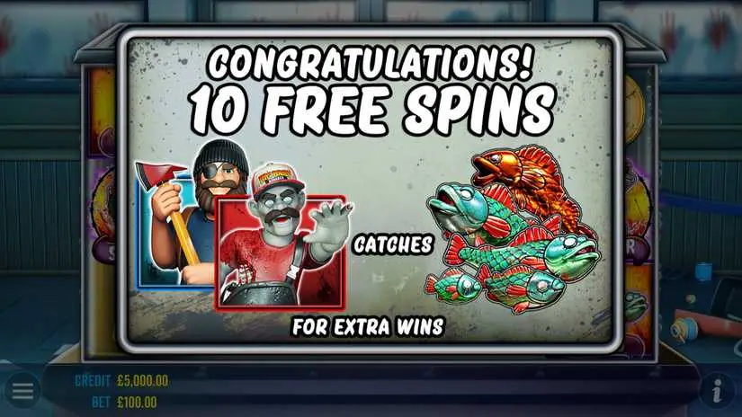 Randomly, when only fish symbols are displayed on the screen without a fisherman, a hook will appear at the end of a free spin, pulling a random reel upward and bringing fisherman symbols onto the screen.