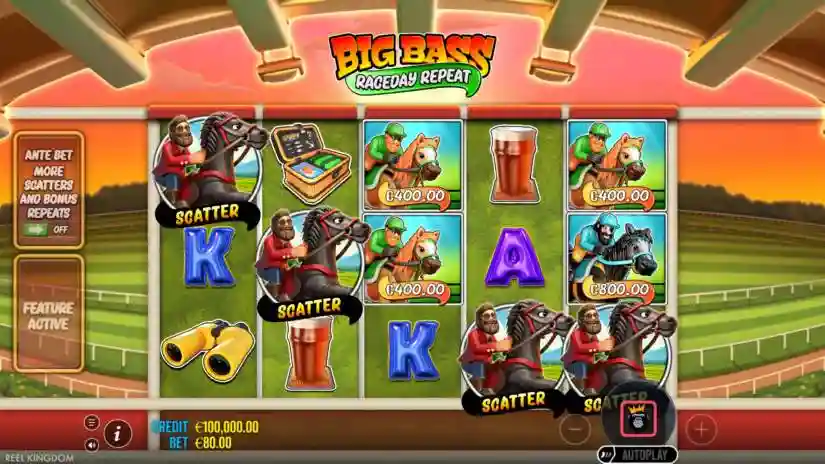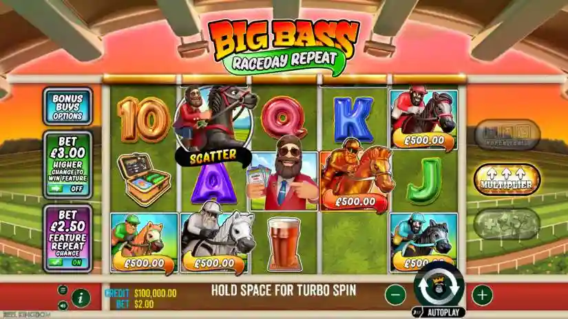 The angler is preparing to return to competition as part of the Big Bass Raceday Repeat program from Reel Kingdom and Pragmatic Play. All symbols pay from left to right on adjacent reels, starting with the leftmost reel.