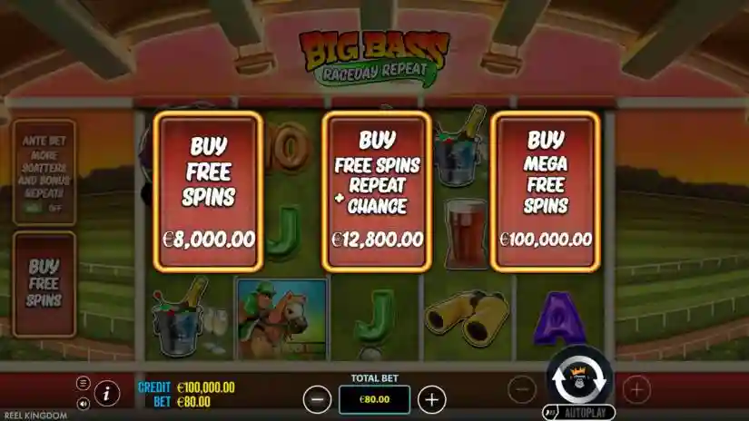 - €/$0.10 per spin is a starting bet in the Big Bass Raceday Repeat